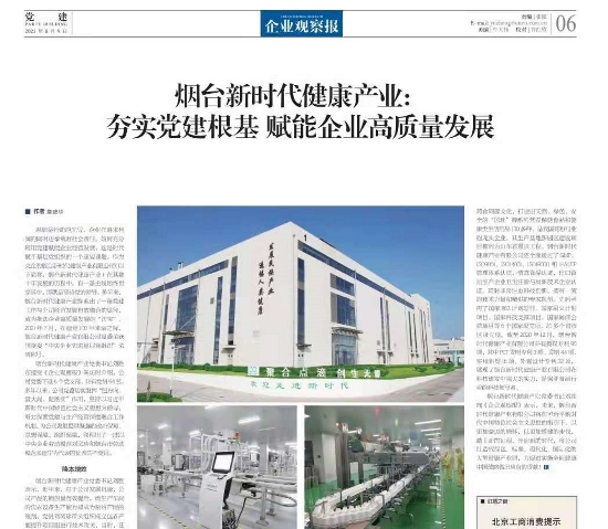 8月9日,《企業(yè)觀察報》以《煙臺新時代健康產(chǎn)業(yè)公司——夯實黨建根基 賦能企業(yè)高質量發(fā)展》為題,專版報道新時代健康產(chǎn)業(yè)(集團)有限公司子公司——煙臺新時代健康產(chǎn)業(yè)公司(以下簡稱“煙臺健康公司”)運用黨建賦能企業(yè)經(jīng)營發(fā)展的經(jīng)驗成果。