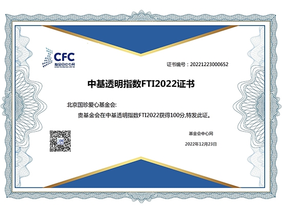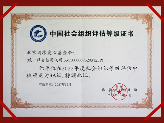近日,在北京市民政局發(fā)布的2022年度社會組織等級評估中,北京國珍愛心基金會榮獲AAA級社會組織評估等級,并在基金會中心網(wǎng)發(fā)布的中基透明指數(shù)FTI2022中,獲得透明度滿分100分殊榮。