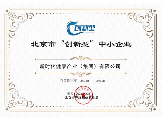 近日,新時代健康產(chǎn)業(yè)(集團)有限公司憑借突出的科研及融合發(fā)展的創(chuàng)新能力,成功通過北京市經(jīng)濟和信息化局“北京市‘創(chuàng)新型’中小企業(yè)”認定,榮獲認定證書。