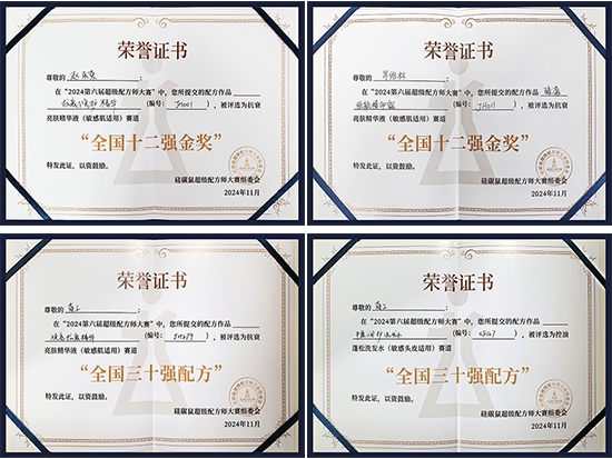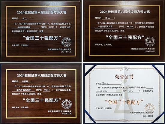 本次大賽在廣州舉辦,吸引了全國各地500多位頂尖配方師人才,創(chuàng)作出近600款產(chǎn)品配方參與評比,競爭異常激烈。經(jīng)過6個月的激烈角逐,健康產(chǎn)業(yè)公司參賽配方師們從眾多參賽者中脫穎而出,最終趙樂榮、牟維林兩位選手榮獲護膚賽道“全國十二強金獎”,蔣一博榮獲護膚及洗護雙賽道“全國三十強配方”,畢利順榮獲洗護賽道“全國三十強配方”。