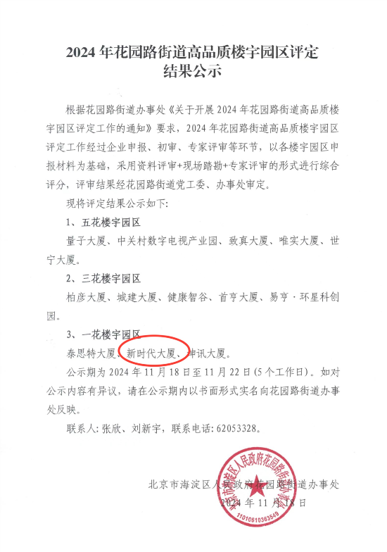 花園路新時代大廈堅持從客戶需求出發(fā),著力推動樓宇服務向著專業(yè)化、智能化方向發(fā)展,積極發(fā)揮大廈服務品牌效應,注重提升服務品牌的知名度和影響力。今年,新時代集團所屬世紀物業(yè)公司參與申報了花園路街道高品質樓宇園區(qū)評定工作,經(jīng)過資料評審、現(xiàn)場踏勘、專家評審、結果公示等多輪評審工作后,花園路新時代大廈在2024年海淀區(qū)花園路街道高品質樓宇園區(qū)評定中榮獲“一花樓宇園區(qū)”稱號,并將按照街道有關獎勵辦法,獲得3萬元資金獎勵。