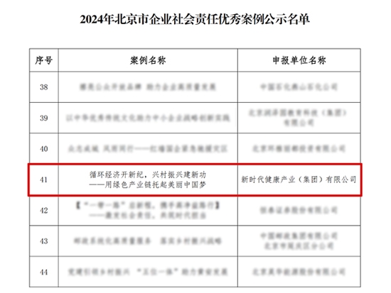 12月11日,北京企業(yè)聯(lián)合會、北京市企業(yè)家協(xié)會正式發(fā)布2024年北京市企業(yè)社會責(zé)任優(yōu)秀案例名單,健康產(chǎn)業(yè)公司申報的《循環(huán)經(jīng)濟(jì)開新紀(jì) 鄉(xiāng)村振興建新功——用綠色產(chǎn)業(yè)鏈托起美麗中國夢》贏得專家評審組一致好評,榮獲“2024年北京市企業(yè)社會責(zé)任優(yōu)秀案例”。