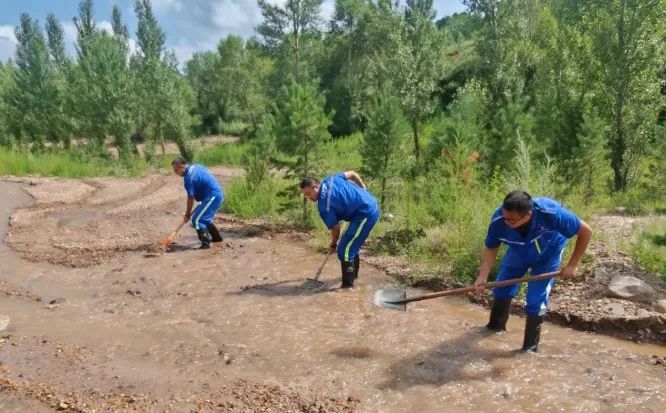 風電公司洗馬林10萬千瓦風電場運維人員對存在積水積沙積石的溝道進行清理